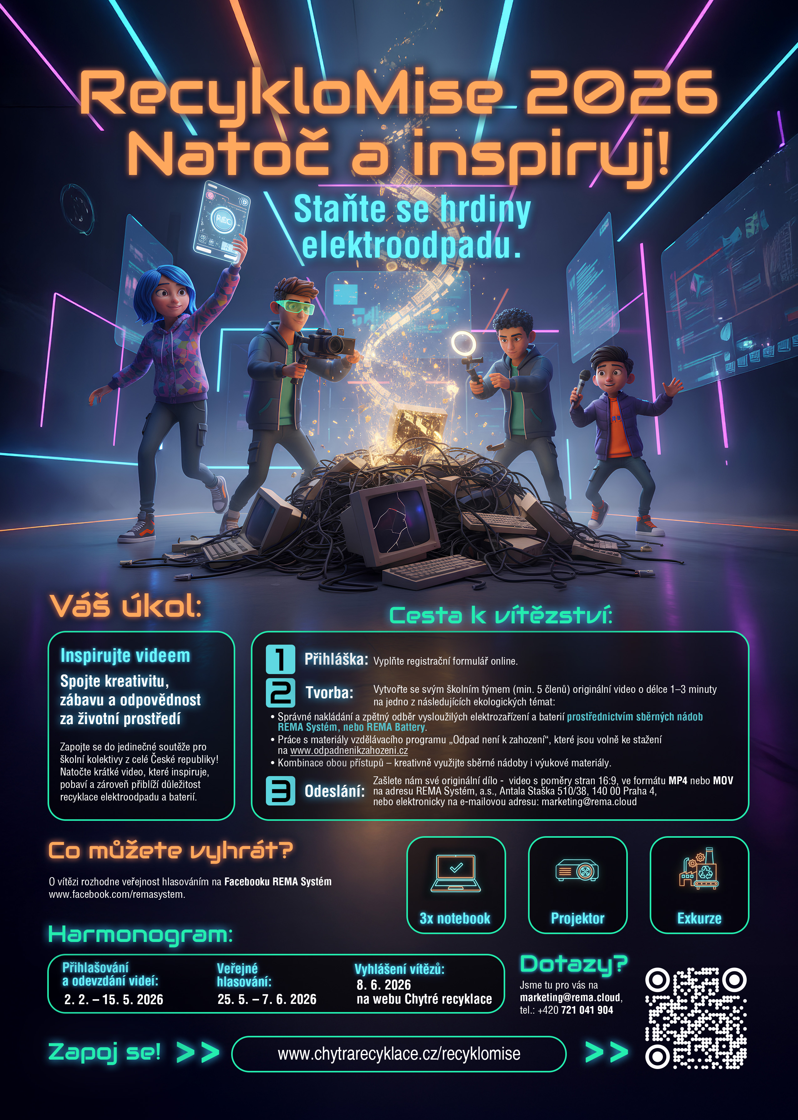 zapojením do výzvy RecykloMise 2026 se můžete stát inspirací pro svou generaci?Přihlaste se do RecykloMise ještě dnes a ukažte, že vaše škola ví, jak na chytrou recyklaci. Jako studenti máte jedinečnou příležitost ukázat, jak jednoduché změny ve vašem každodenním životě mohou mít velký dopad na životní prostředí.