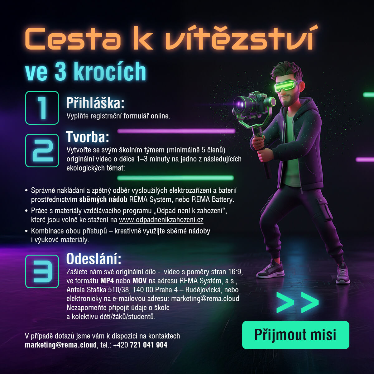 Zašlete nám své originální dílo - video s poměry stran 16:9, ve formátu MP4 nebo MOV elektronicky na e-mailovou adresu: marketing@rema.cloud, nebo na nosiči na adresu REMA Systém, a.s., Antala Staška 510/38, 140 00 Praha 4 – Budějovická. Nezapomeňte připojit údaje o škole a kolektivu dětí/žáků/studentů.